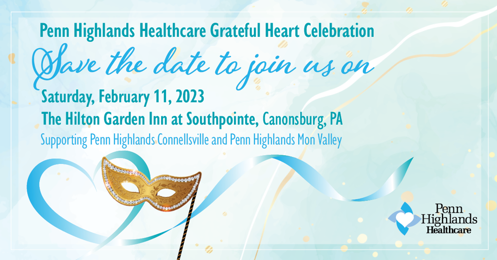 Mark your calendar to attend The Grateful Heart Celebration of Penn Highlands Connellsville and Penn Highlands Mon Valley! The masquerade-themed event will be held on Saturday, February 11, 2023, in the Ballroom at the Hilton Garden Inn, Southpointe.