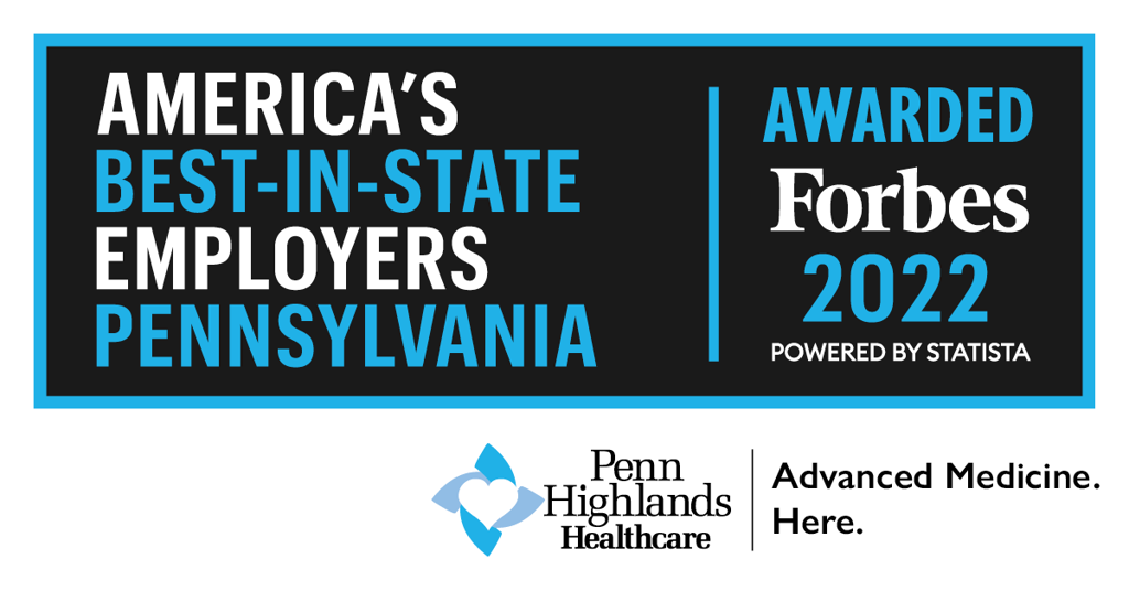 America's Best-in-State Employers 2022 were identified in an independent survey based on a vast sample of approximately 70,000 Americans working for companies with more than 500 employees in the U.S. The respondents were asked to rate their willingness to recommend their own employer to friends and family. The online survey also asked the participants to evaluate whether other businesses in their community stand out positively or negatively. When the survey was tallied, Penn Highlands Healthcare was in the Top 100 for Pennsylvania. Only 17 healthcare providers in Pennsylvania even made the list! The complete list of awards can be viewed on the Forbes website.