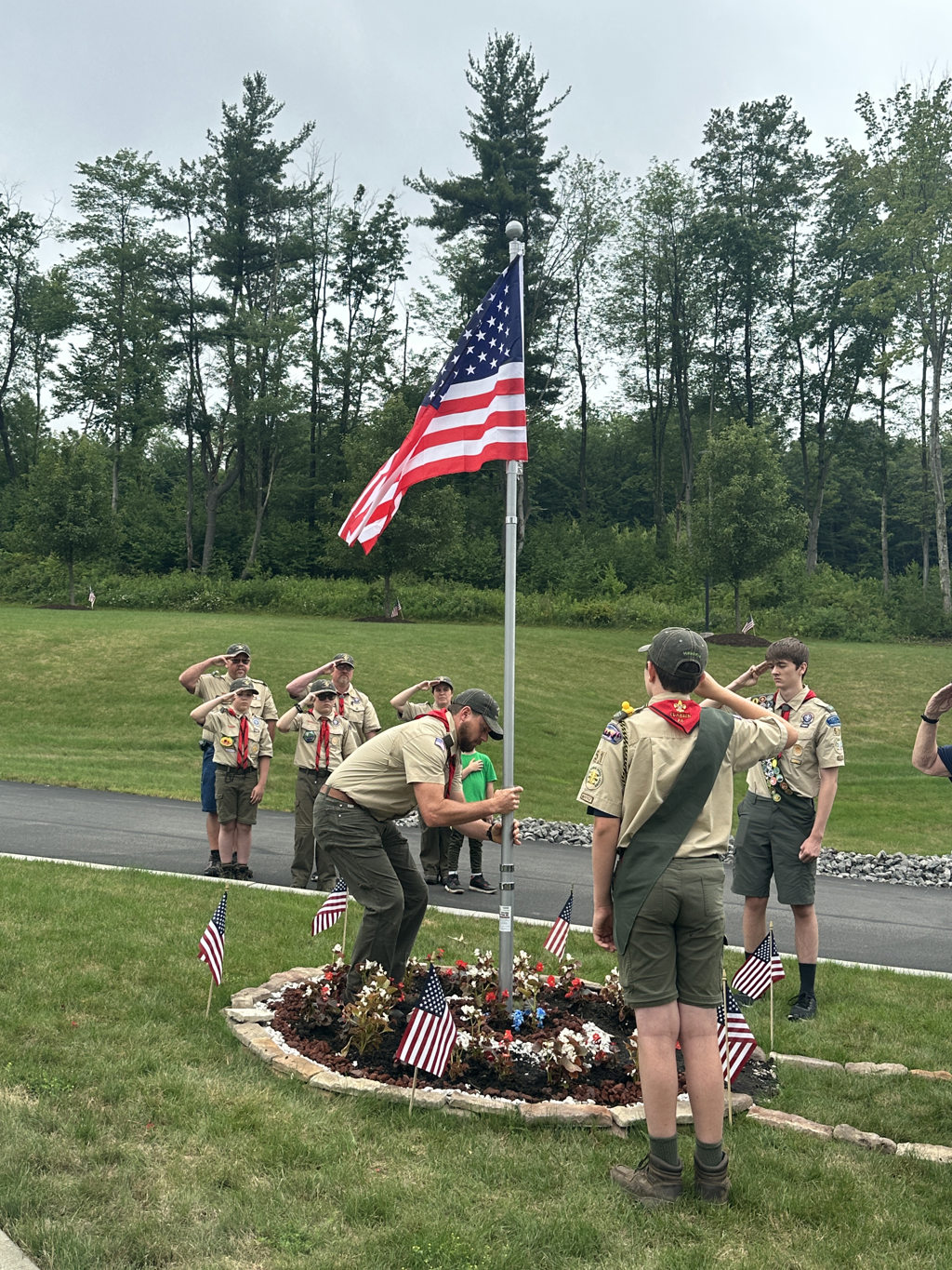 On July 3, 2023, U.S. veterans and members of the community were on hand to witness local scouts raise the new flag at Highland Oaks at Water Run Landing. The senior living community is part of Penn Highlands WRC Senior Services. The three-story facility is home to 60 older adults including 11 veterans.